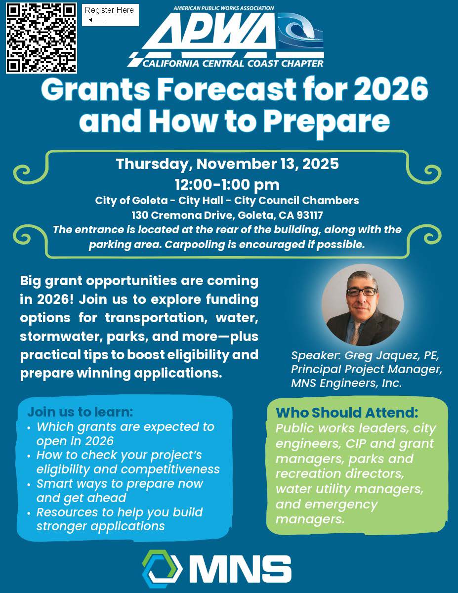 In 2026, a wide range of grant opportunities will become available to support public works capital improvement needs. These programs are expected to address critical areas such as highway safety, congestion mitigation, active transportation, water supply and drought resilience, stormwater management, parks and community facilities, environmental enhancement, wildfire prevention, and flood protection.